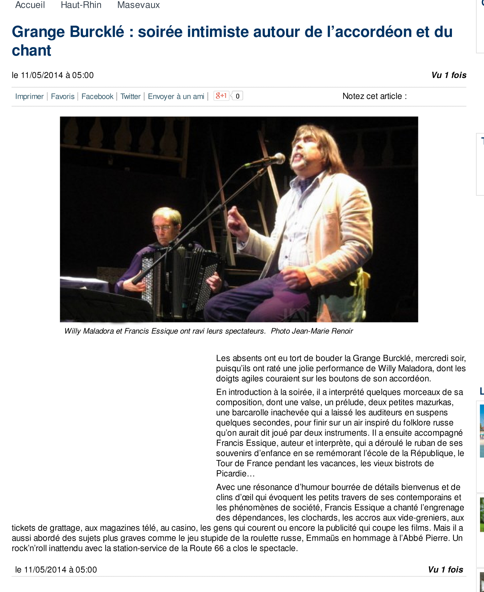 La grange Burcklé, le lieu culturel de la vallée de la Doller et bien au-delà, nous a fait l'honneur de nous inscrire dans sa programmation 2014.